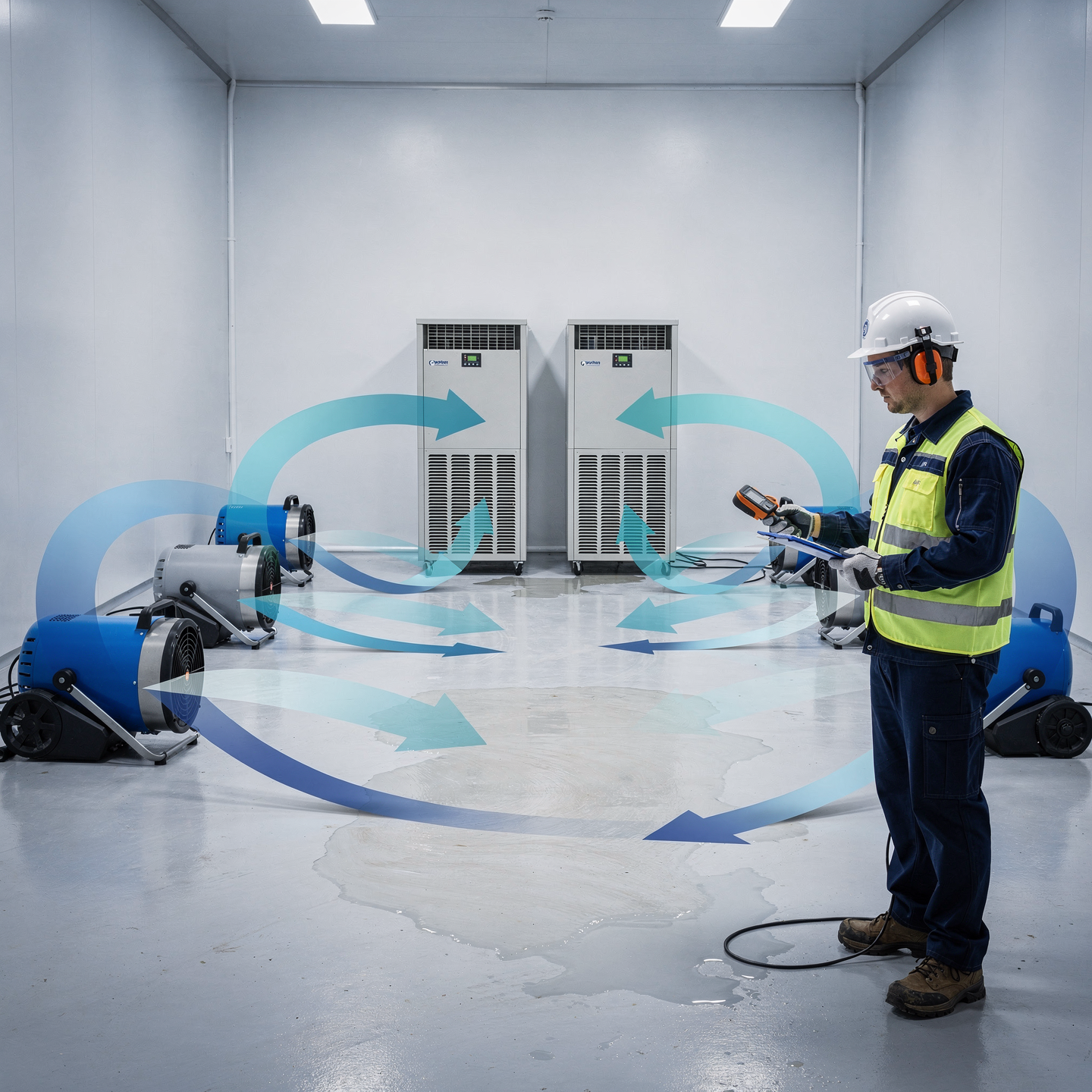 Professional air circulation equipment that accelerates evaporation and drying times. Strategic placement promotes airflow across wet surfaces, carpets, and building materials for faster moisture removal.